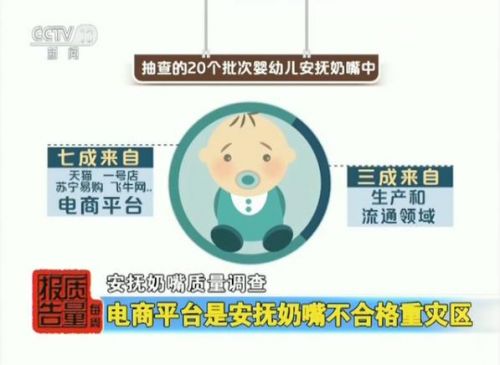 本次共抽查产品20批次安抚奶嘴,七成来自天猫、一号店、苏宁易购、飞牛网等电商平台,三成来自生产和流通领域,不合格产品为10批次,也就是说,有一半抽查到的婴幼儿安抚奶嘴产品质量是不合格的。